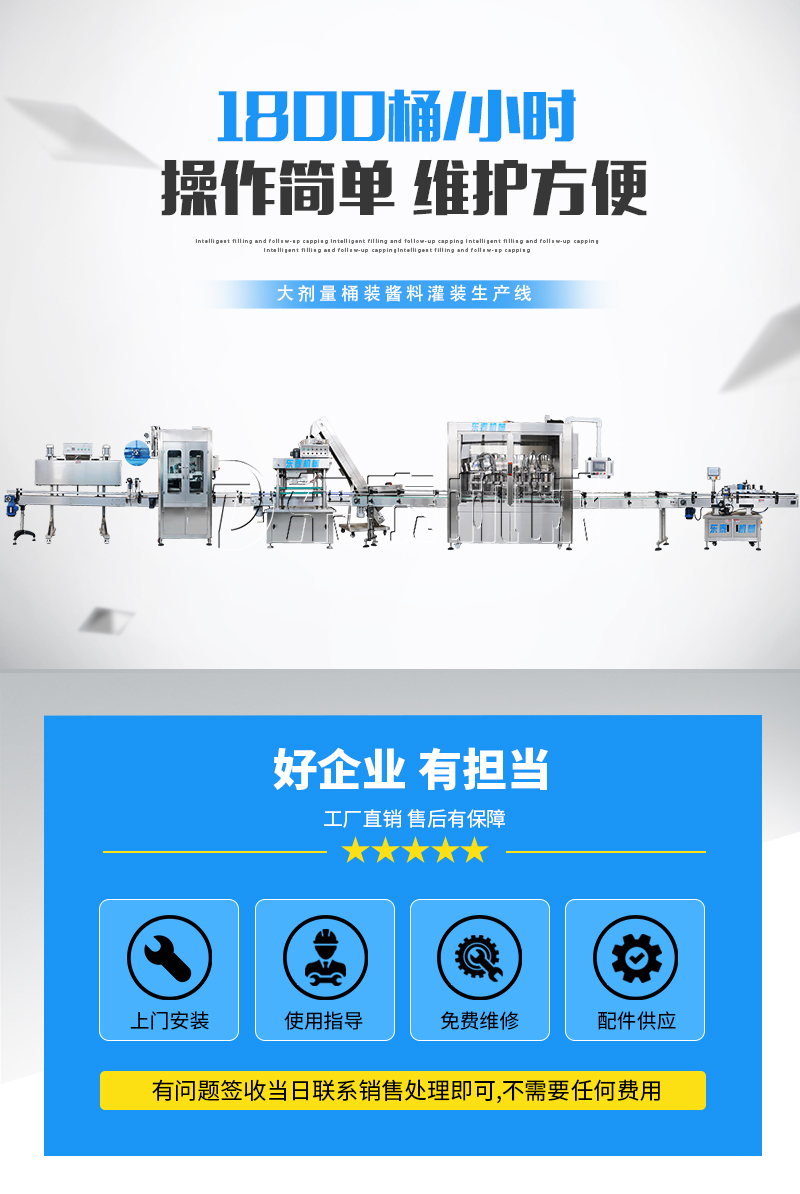 該系列灌裝機采用活塞式伺服系統驅動原理,適用于粘流體中帶小顆粒并且可流動的較為粘稠的物料灌裝。比如:洗衣液、洗潔精、甜面醬、沙拉醬、芝麻醬、食用油等的灌裝。設備采用伺服系統定量推料,在人機界面數字化調節計量,并且可設定所需計量,觸摸屏一觸即達,而且可以單頭微調計量。操作簡單,維護方便,節省人工成本,生產效率更高。