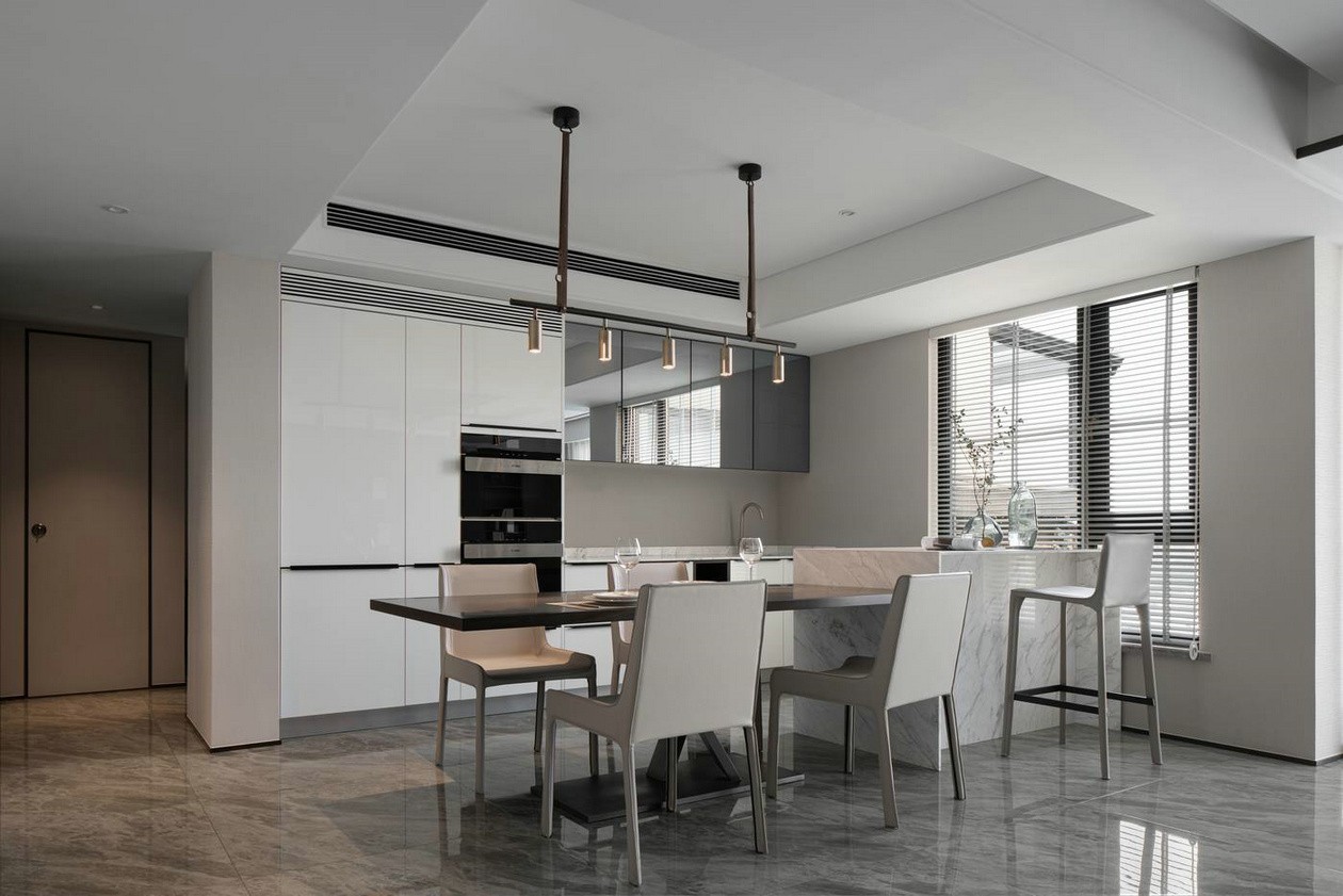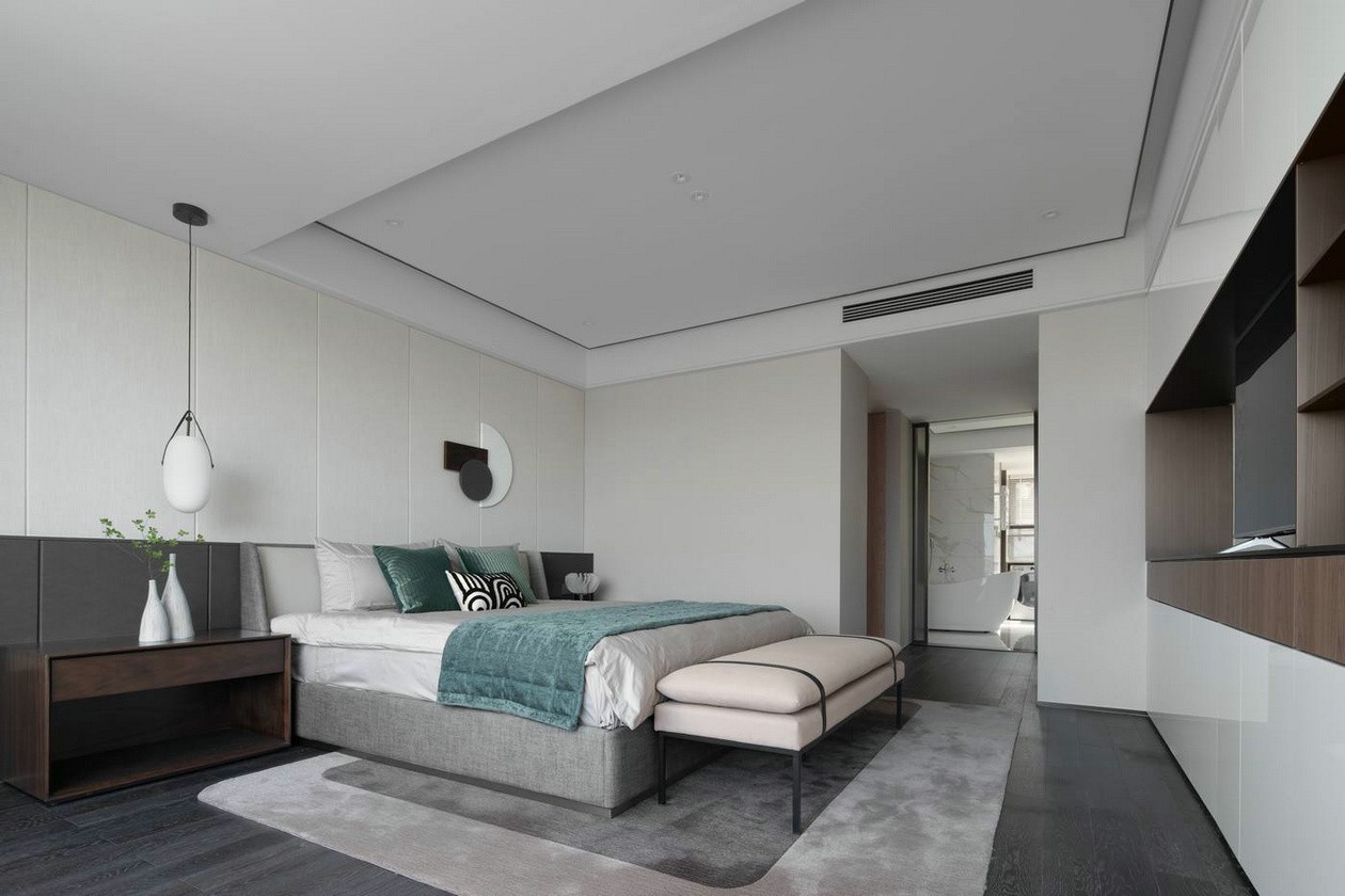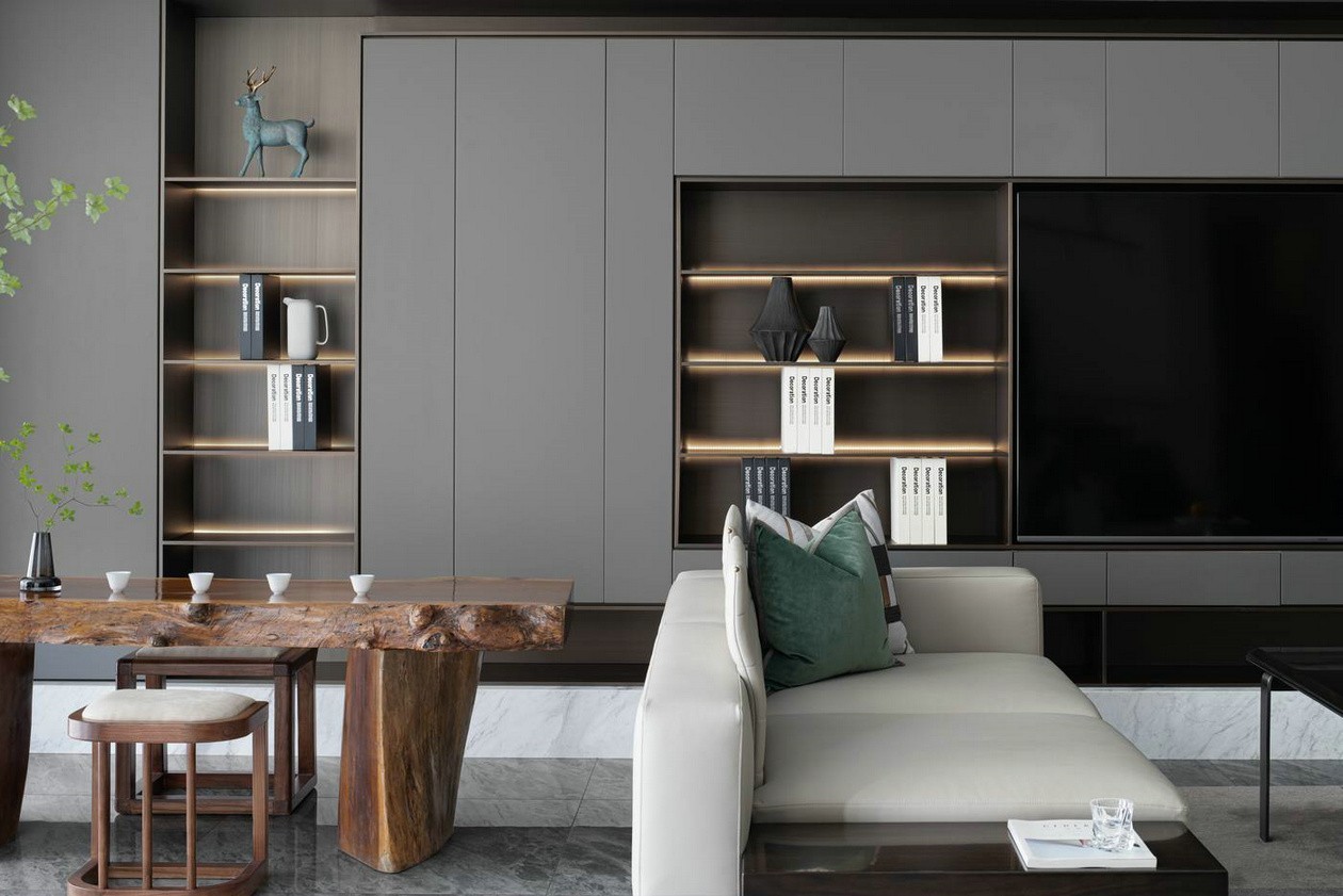 客廳茶室一體結(jié)合的做法,使空間體量有所增加,開闊的空間體驗也在無形中影響著業(yè)主的生活模式。