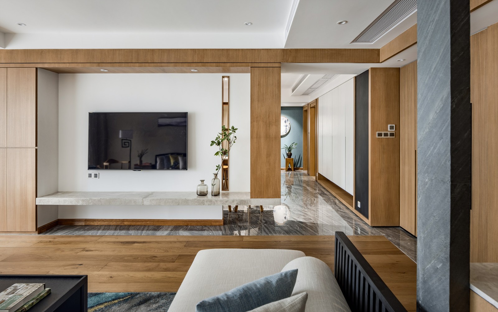 電視背景墻采用原木、大理石、乳膠漆加一點綠植,返璞歸真的生活感受。