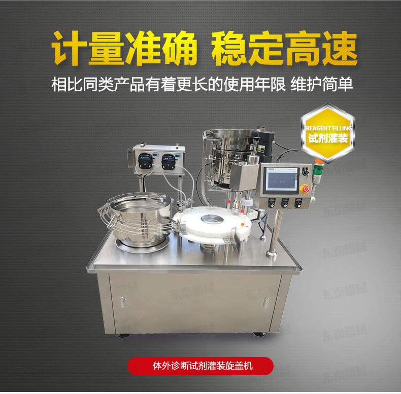 診斷試劑灌裝旋蓋一體機在性能上、質量上液體灌裝機具有高速、可靠性強、產量高等優點,為整個行業的發展來說帶來了巨大的發展商機,也為液體類商品帶來更廣闊的發展前景。液體灌裝機的操作簡便,運行穩定,能有效節省企業成本,即可單機使用,也可進行搭配理瓶機、液體灌裝機、旋蓋機、封口機、貼標機等等設備組成一條生產流水線作業,各單機能獨立完成其工作,有獨立的操作系統,各單機聯動、分離快捷,并且調整快速、簡單,使生產的每個工序保證協調。廣泛應用于食品、化妝品、醫藥、油脂、日化、洗滌劑、農藥、化工等行業的灌裝。